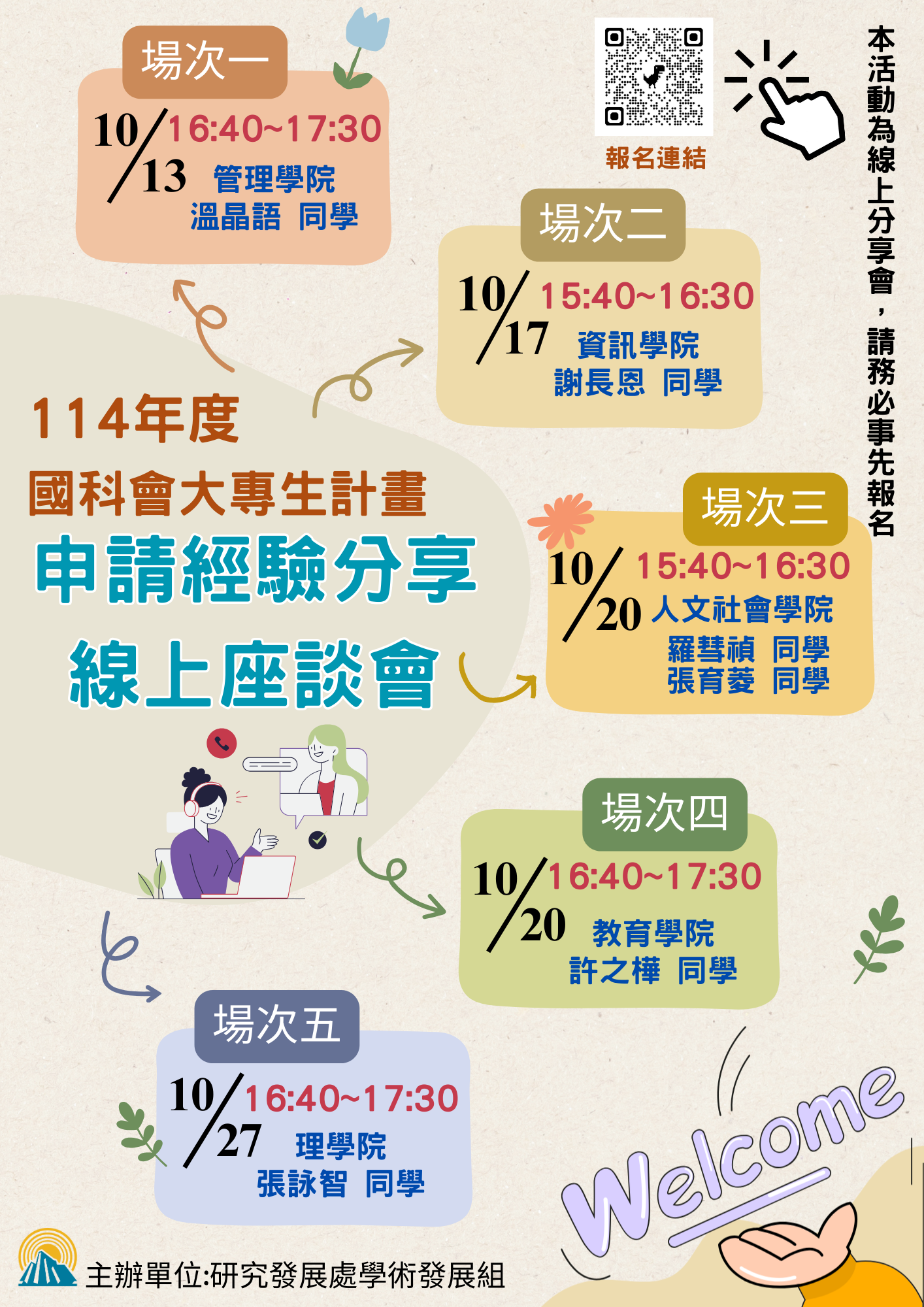 【研發處-辦理大專生線上講座】執行國科會大專學生研究計畫經驗分享暨交流線上座談會,報名截止日為10月9日(星期四)17時止。